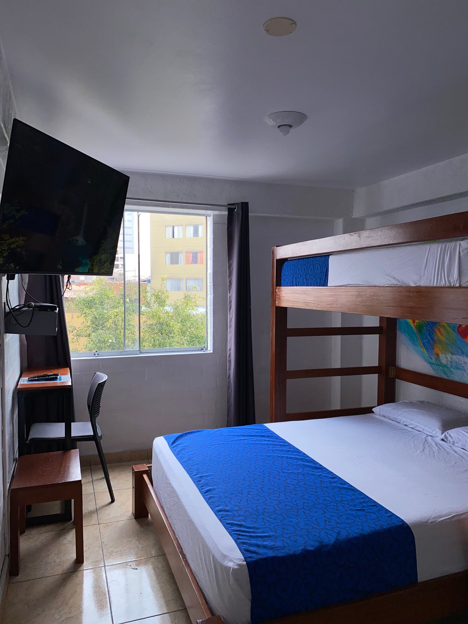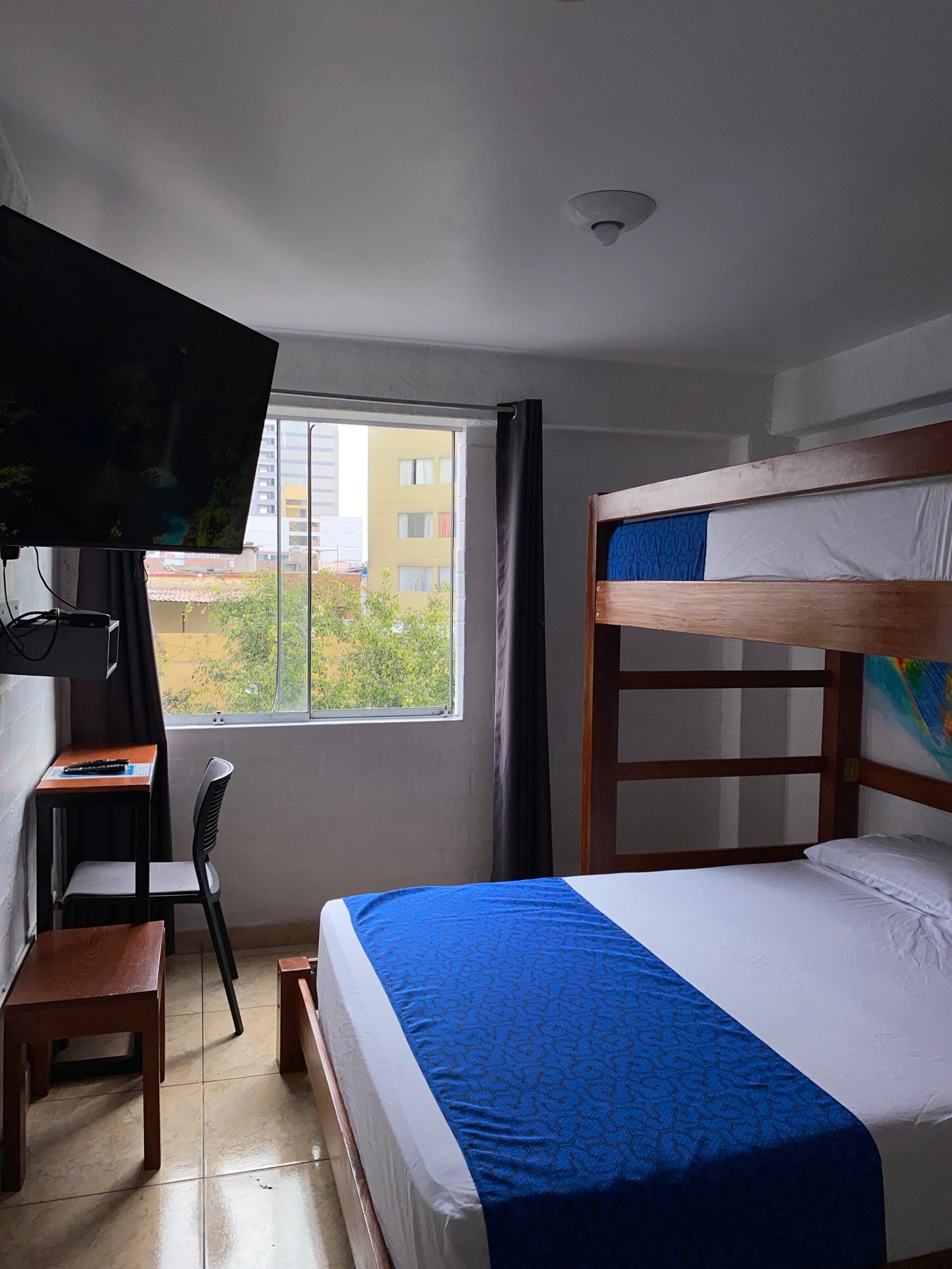 Acogedora habitación matrimonial de 11 m², perfecta para parejas o viajeros. Cama Queen + Litera de plaza y media, ambiente tranquilo y funcional, ideal para descanso o trabajo. Rentals por noche o largas estadías en Lima, cerca de zonas turísticas y comercios.